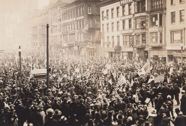 Armistice Day, 1918. The J.C. Wilson Co. clock and iron fronts are on the right hand side.