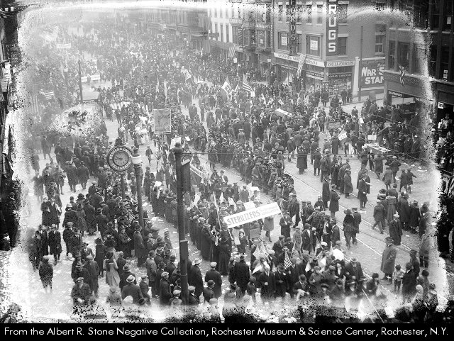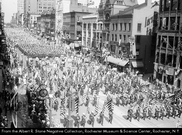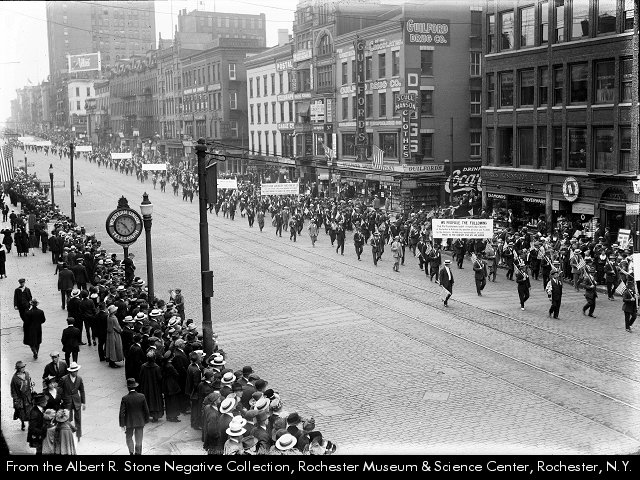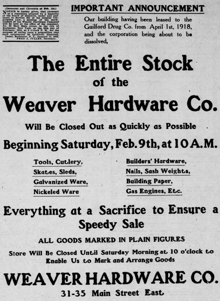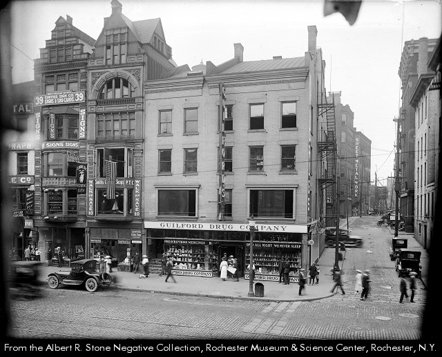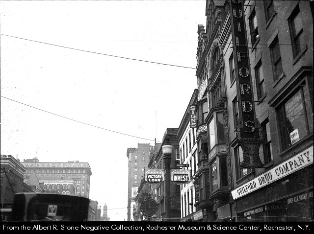 An advertisement for War Savings Stamps graces the wall of Guilford’s Drugs. The view is from the Powers Block, and the dark buildings in the center background are 37 & 39 East Main Street. The building in front of it, with the DRUGS sign is Guilford Drug Co., 31-35 East Main Street, opened at this location this year, 1918. The clock in the foreground is the Western Union Telegraph clock in front of Reynold’s Arcade.