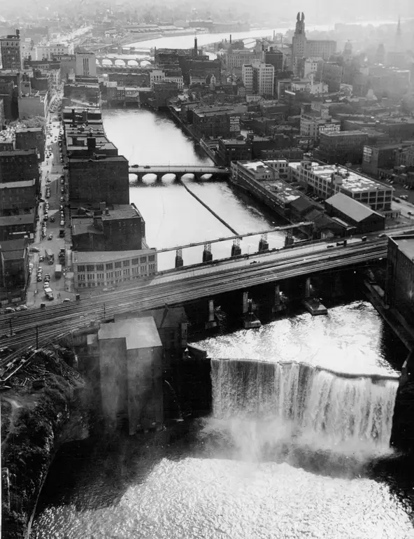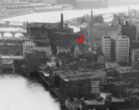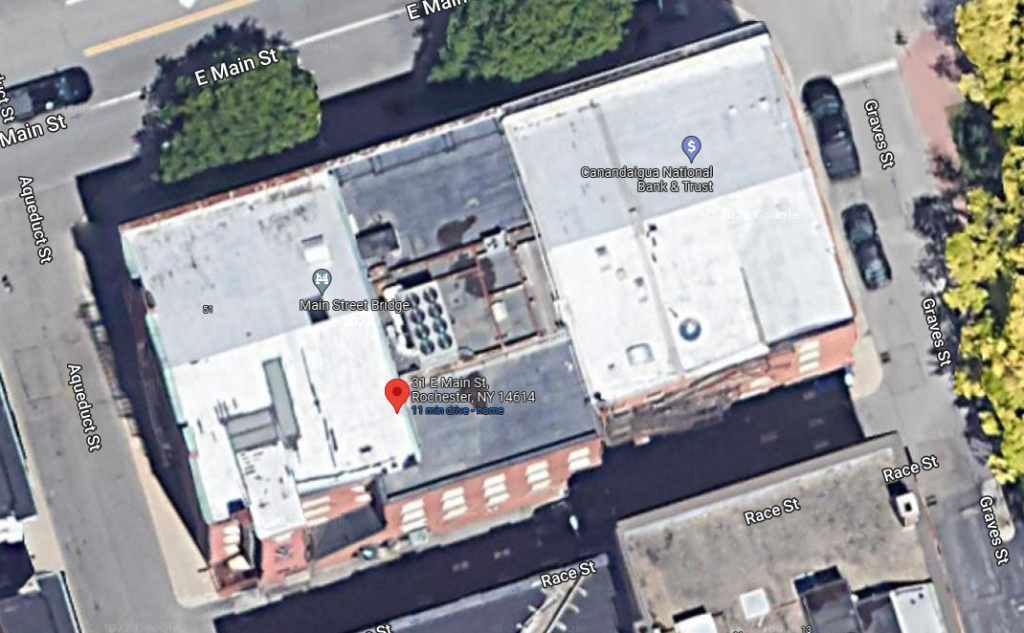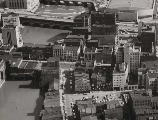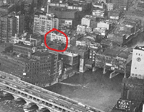 In this cropped aerial image from 1965, the buildings on Main Street bridge can be seen at left. The first cross street where the bridge meets the river bank at center is Graves. One can see Nos. 37 & 39 are gone, replaced by the present-day building at 31 East Main Street. Note the distinct difference in shade where the new building replacing Nos. 37 & 39 meets the original No. 31 East Main.