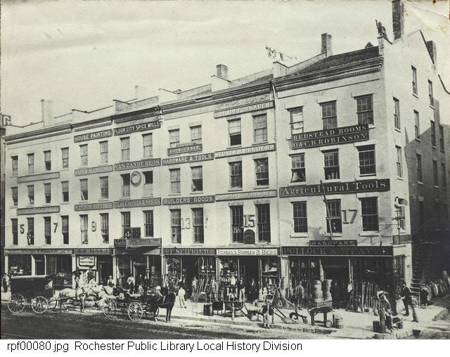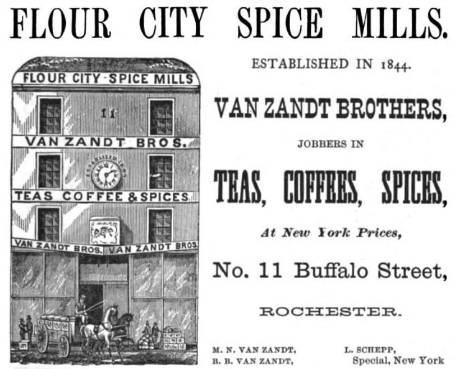 11 Buffalo Street in the above photo was the building eventually to become 39 East Main Street. At the address was Flour City Spice Mills, the business of John J. Van Zandt & Co, which would become Van Zandt Bros. Teas Coffee & Spices, proprietors John J., Benjamin B. and Maxcy N. Van Zandt. The business would later be known as M. N. Van Zandt & Co.