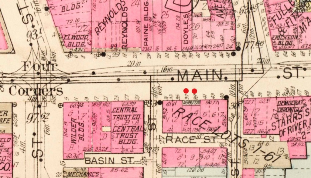 Look, if you will, upon these five-storey buildings to the left of this photograph above. Those buildings are (or rather were) 37 and 39 East Main Street, in the year 1918. I first started to notice this pair of buildings while looking through historic photos of the Four Corners area; tall and dark, they stood out–and yet were seemingly always at an oblique angle, in the incidental background of some shot of another centrally-focused building, or barely-rendered in some turn-of-the-20th-century postcard or other. They were coy, and it enticed me to discover their nature.