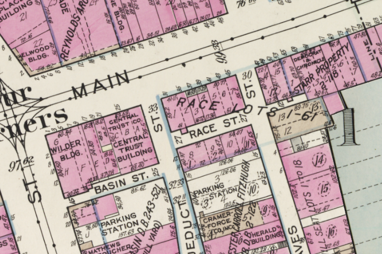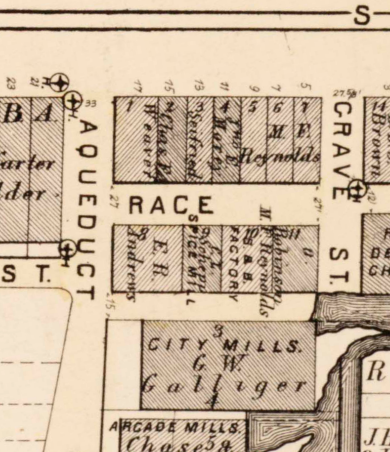 The lots are labeled “MILLYARD & MILL LOTS” due to being the former site of Ely family mills, powered by the race which flowed under the boards of these streets. The cast-iron fronts do not appear to have yet been added to the buildings, as seen in the 1892 Sanborn map.