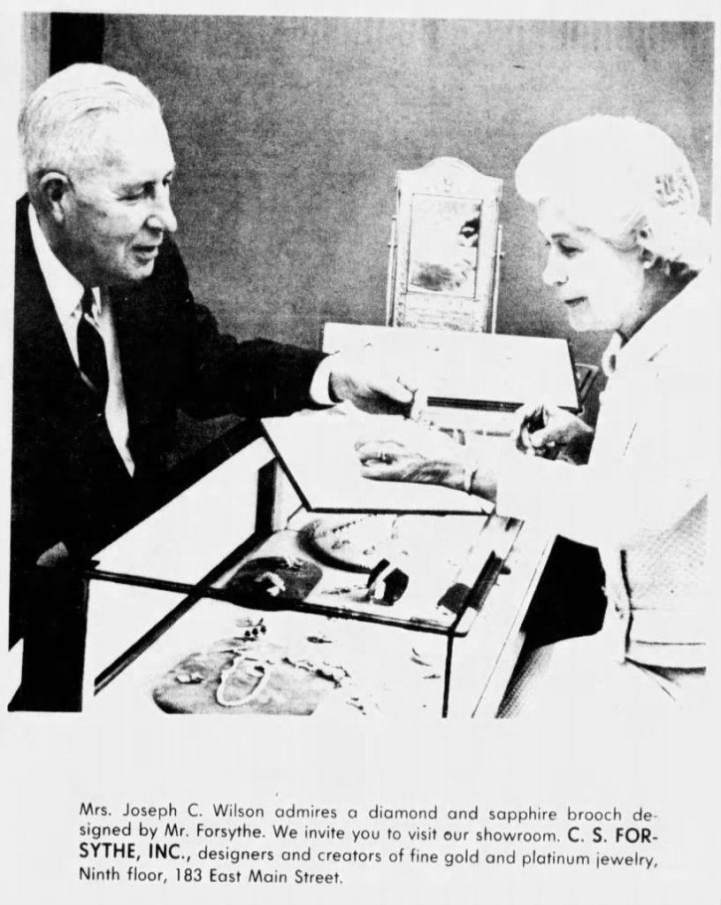And to bring it back around to 39 East Main Street, here is the wife of Joseph C. Wilson, Marie (“Peggy”) Curran Wilson at C. S. Forsythe, Inc. Jewelers, formerly at 39 East Main Street, in 1967. By this point, the old iron storefronts of her husband’s accomplished grandfather were twelve years or more gone.