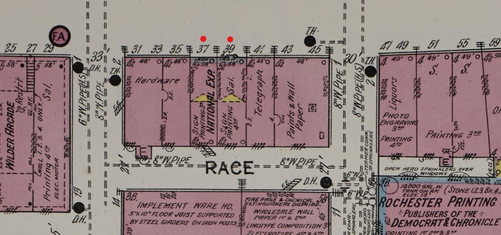 This unusual shot, above, is an aerial photograph taken by Albert R. Stone from an airplane as it flew over various sites in the city of Rochester. The vantage point in this photo would have been somewhere over Race Street looking north over the tops of Nos. 37 & 39 East Main Street. The perspective lends us some insights: it appears as though the original Buffalo Street “Hardware Row” buildings were augmented by adding additional floors with peaked gable roofs; onto the façade of these additions, the cast-iron fronts were installed.