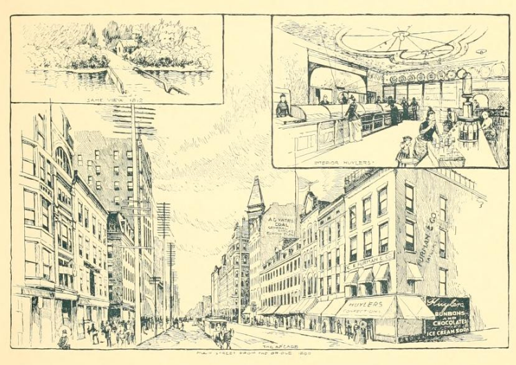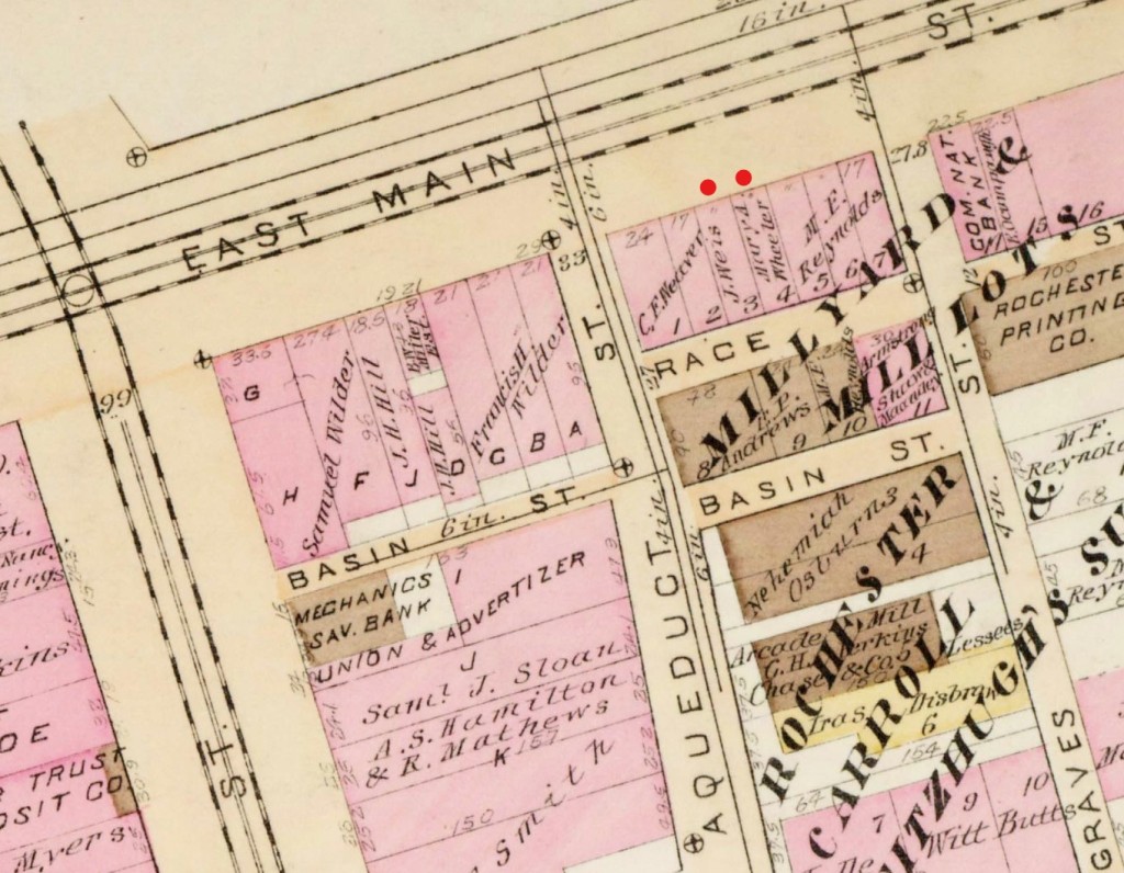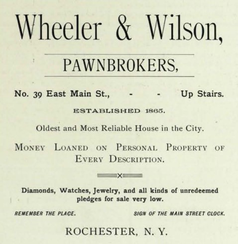 The above photograph is from History and Commerce of Rochester, published in 1892. While the buildings are not visible in the photograph, a clock reading “Wheeler & Wilson, Pawn Brokers” is present to the left.