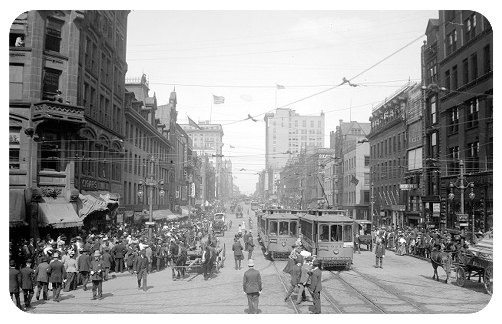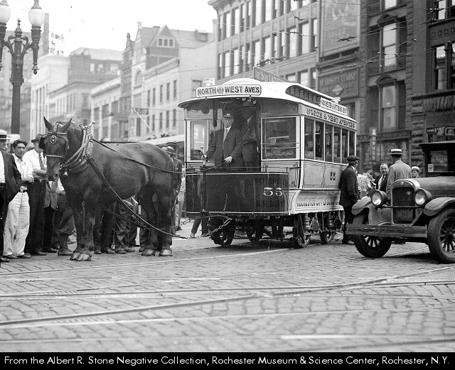 This picture of a horse trolley on East Main shows the peaked roof buildings of Nos. 37 & 39 looming over the back of a horse. The horse and trolley are from Rochester’s horsecar company retired in 1890, brought back out for the 1934 Centennial.