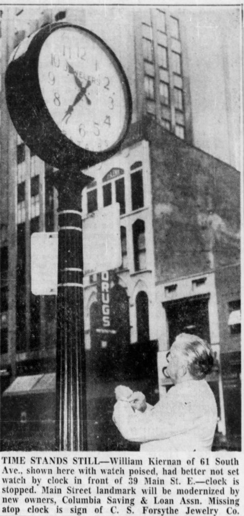 At some date prior to 1943, the clock had been replaced with a more modern design bearing brand signage for C. S. Forsythe Jewelry Co. The clock had a white face in a black bezel atop a column. The numerals were in Arabic numerals instead of Roman numerals.
