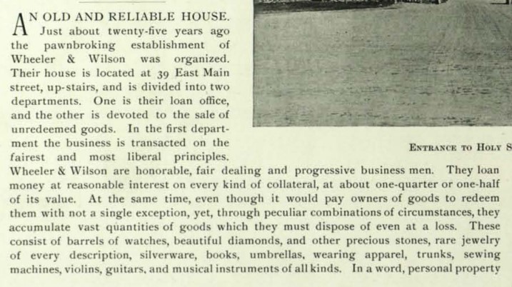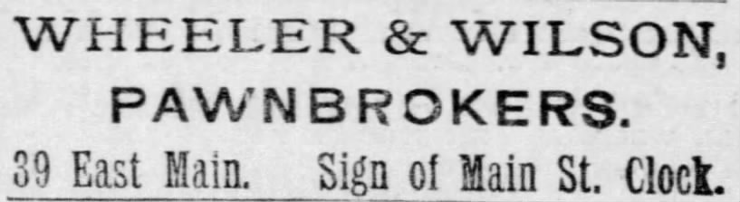Building 4, No. 39 East Main is owned by Mary A. Wheeler, in business with Alice May Wilson–wife of Joseph C. Wilson–as Wheeler & Wilson, Pawnbrokers: