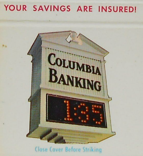 Above: a Columbia Banking matchbook portraying the “Landmark Clocks”