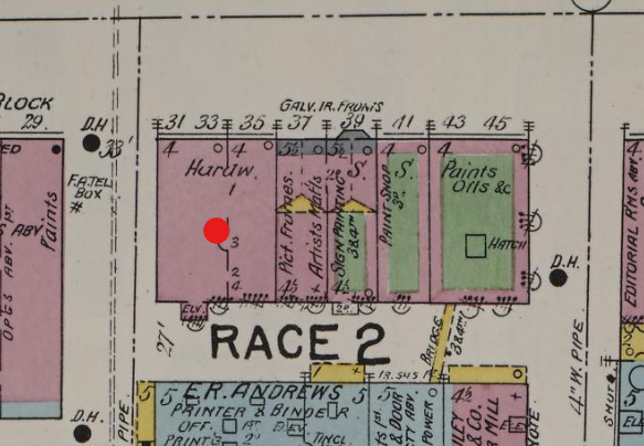This 1950 Sanborn map makes it seem like the iron fronts have been removed by that year, as they have been covered over with the “brick” legend color.