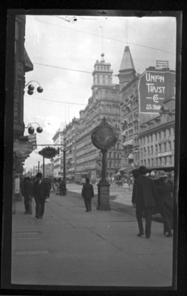 The above photograph by photography pioneer Charles C. Zoller shows the J. C. Wilson Co. clock, center, set against the Powers Building. Also visible are the two tiers of pawnbroker’s balls, sets of three golden balls which traditionally serve as an occupational symbol and signage for pawnbrokers.