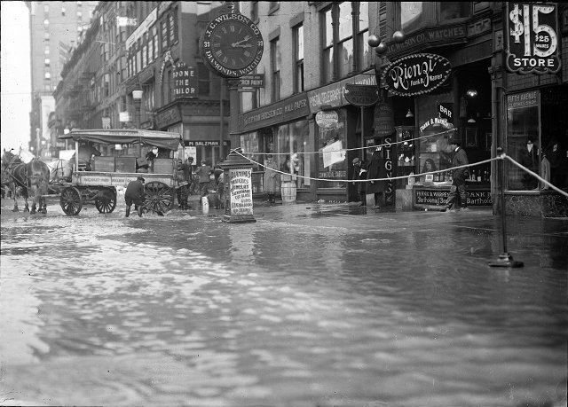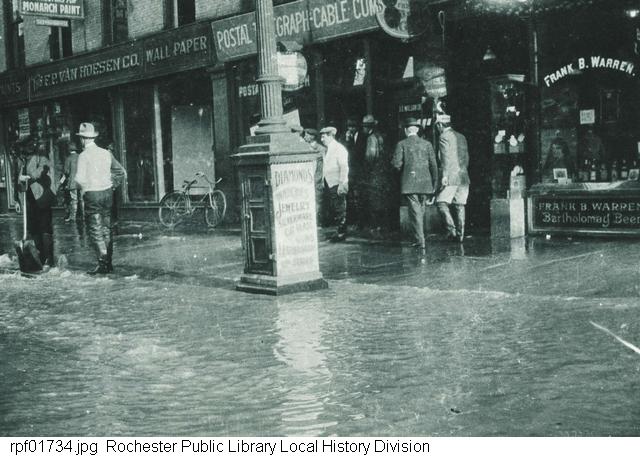 East Main Street at Aqueduct Street looking towards Graves Street. During flooding, as you may have noticed. The J. C. Wilson Co. clock is at center. 37 & 39 East Main Street are at right, with a sign reading “Rienzi | Frank B. Warren” over the door. The iron front under the bay window bears the embossed words “J. C. WILSON CO. | WATCHES”. I suspect it reads “DIAMONDS” as well on the far side of the window.