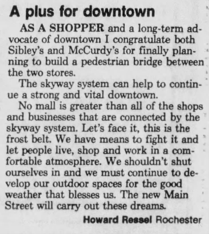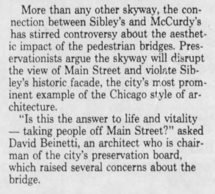 Though proponents of skyways appreciated the connected shopping centers and avoiding the cold weather, opponents bemoaned the disruption of historic views. Merchants at street level on East Main Street were especially voluble with their concerns, noting [fairly accurately] that decreased foot traffic would strangle their businesses while channeling customers into already successful high-end department stores.