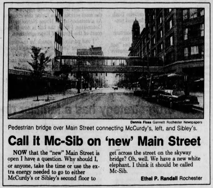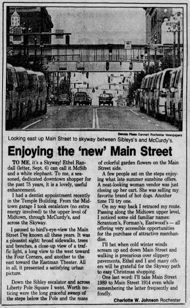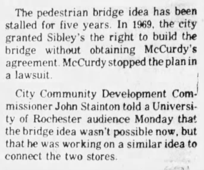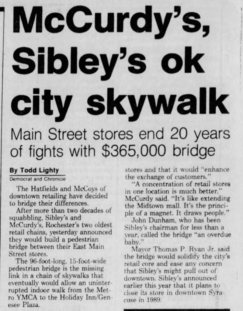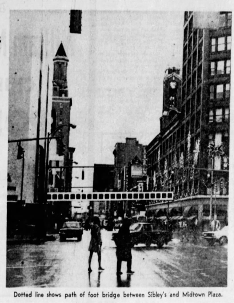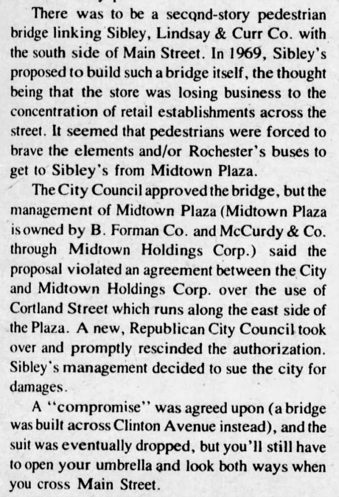 Naturally, the bridge over East Main Street would disproportionately benefit Sibley’s department store, as it would draw from the entirety of Midtown Plaza’s traffic which, in turn, would draw from only Sibley’s. Therefore, McCurdy insisted the walkway would land directly in McCurdy’s store, as opposed to Sibley’s preference of a landing point within Midtown Plaza proper. Due to this sticking point, McCurdy’s blocked the project.