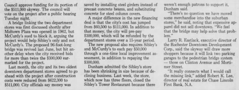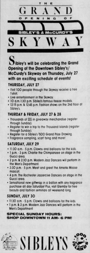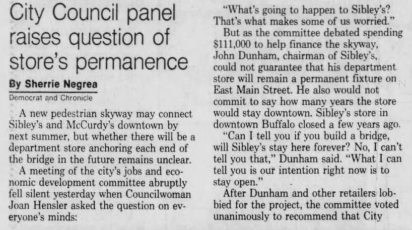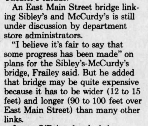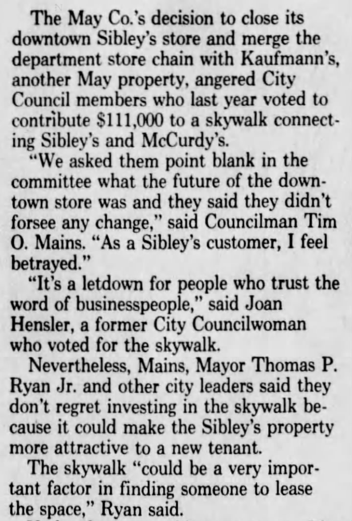 There was another concern making the waters turbulent around the skyway linkage between McCurdy’s and Sibley’s, and I wrote it above. Was Sibley’s about to cut and run? Was it worth building a link between McCurdy’s and a large, defunct building?