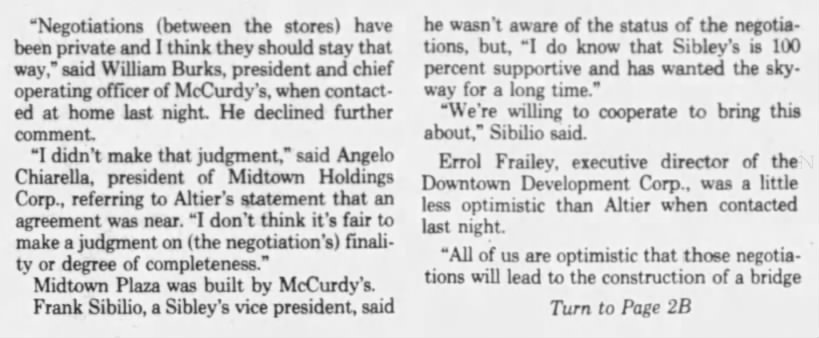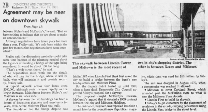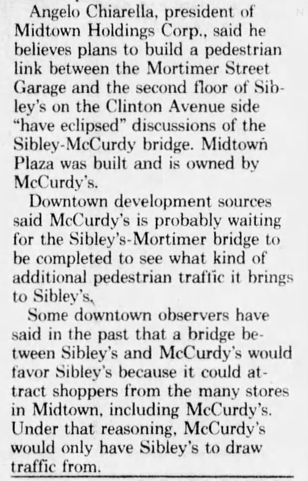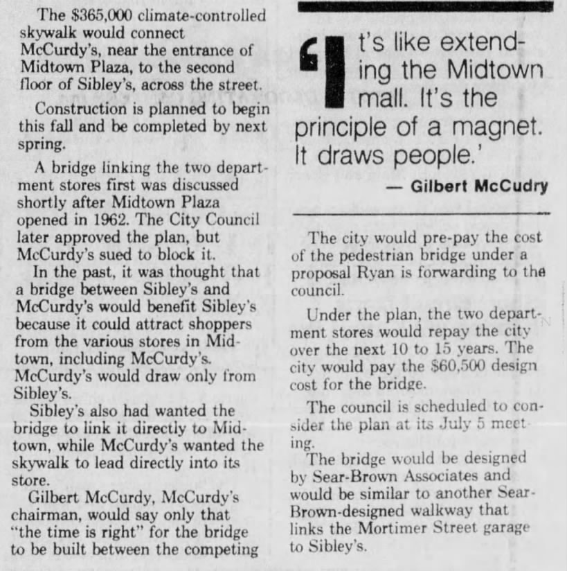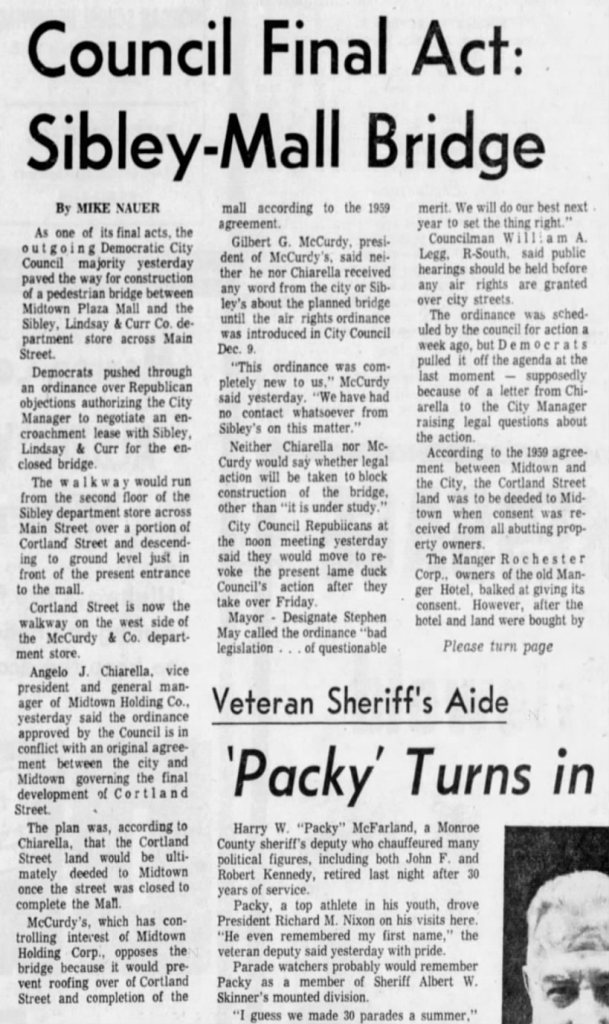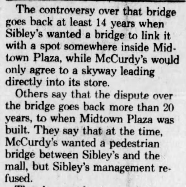 McCurdy’s had also made an agreement with the city that Cortland Street would be deeded to Midtown Plaza after its construction, to be roofed over, and explained that any such bridge would interfere with that plan.