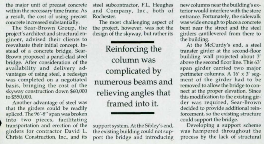 One of these bridges, the still-extant footbridge linking the Sibley building to the Mortimer Street Garage, may have taken some focus away from the slow-moving negotiation process regarding the Sibley’s-McCurdy’s bridge.