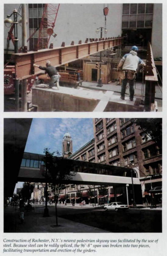 The January-February 1990 issue of “Modern Steel Construction” magazine ran an article detailing some of the planning and construction process behind the bridge, which turned out to be a uniquely challenging construct. For one, though it was meant to match up with the cast-concrete pedestrian bridge over Clinton Avenue, Canadian suppliers were unable to guarantee the amount of prefabricated concrete necessary, increasing concrete costs and necessitating a greater proportion of steel construction for the footbridge.