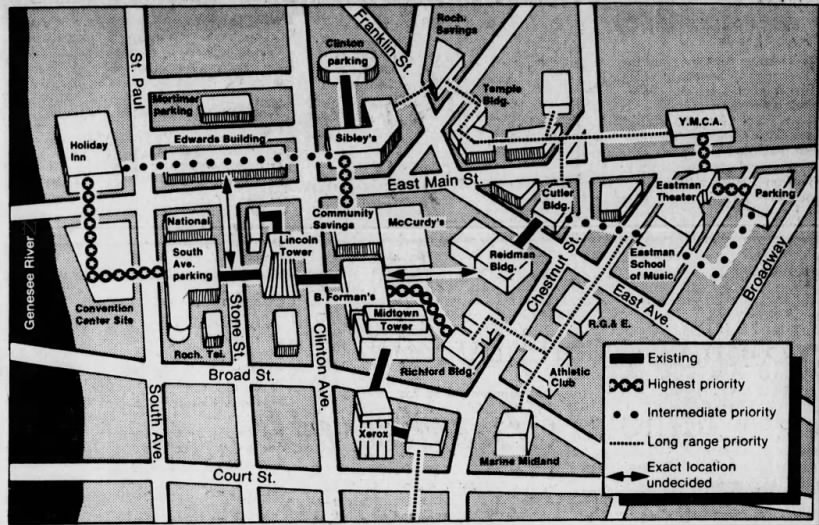 As one can surmise from the below map published in a 1982 issue of the Democrat & Chronicle, the city of Rochester had a far-reaching and complex plan for the development of the Skyway system of pedestrian bridges: