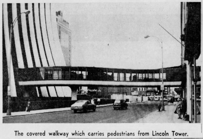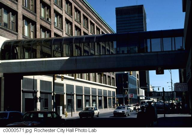 A second bridge project was allowed to go ahead. This would be the first official bridge in the blossoming Skyway system: the curvaceous covered walkway between the Lincoln Tower [later the Chase Tower, today the Metropolitan Building] and Midtown Plaza over South Clinton Avenue.