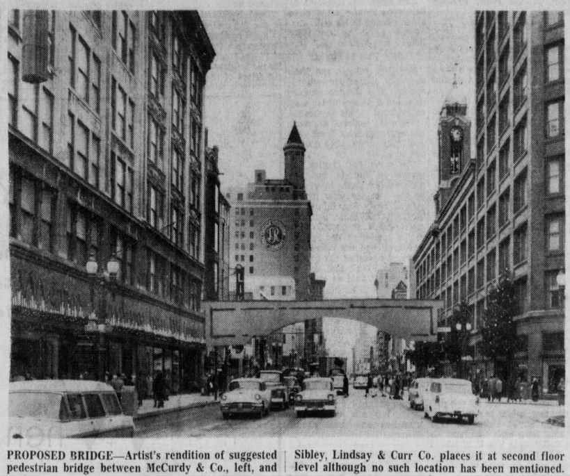 Thus it’s no surprise that the idea of a pedestrian bridge linking up the two titans across East Main Street was floated even back in this age, when McCurdy’s pet project Midtown Plaza was just a schematic drawing. Unlikely as cooperation between the two competing stores may have seemed, the boon to commercial pedestrianism was an obvious sell.