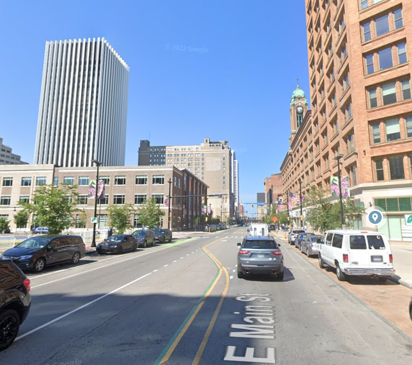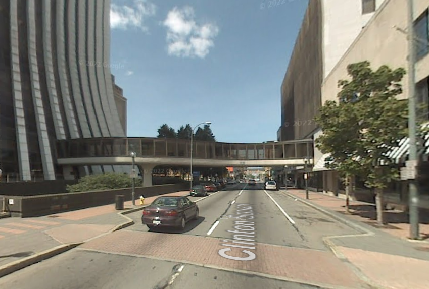 The “compromise” bridge over South Clinton Avenue, between Lincoln Tower [Chase Tower, Metropolitan Building] and Midtown Plaza.