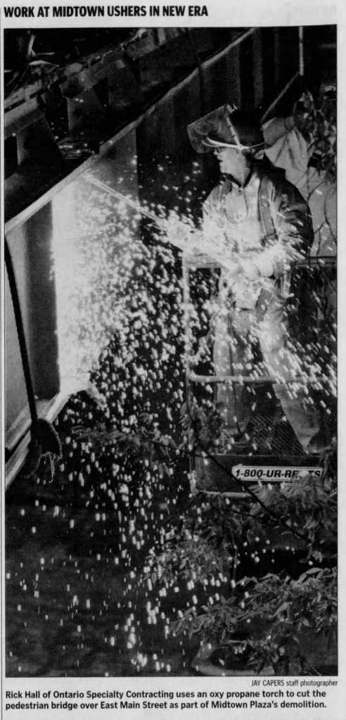 The walkway celebrated its first full decade of use just around the turn of the new millennium. The two great retail giants who had struggled so long to give birth to the bridge were both defunct, with McCurdy’s having shuttered its operations as of July 1994. Six years on from that, the bridge stretched between a Midtown Plaza which struggled to maintain tenants, and a Sibley building that suffered similarly.
