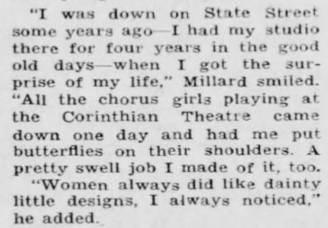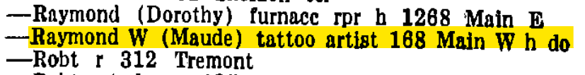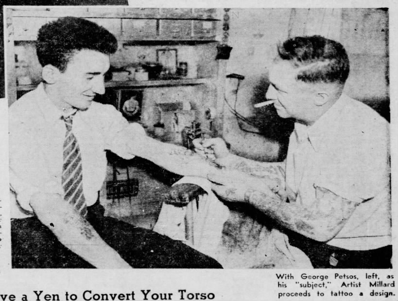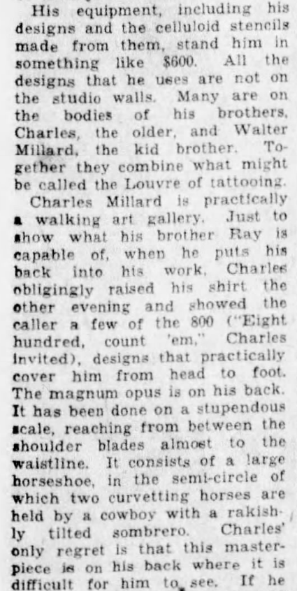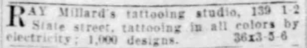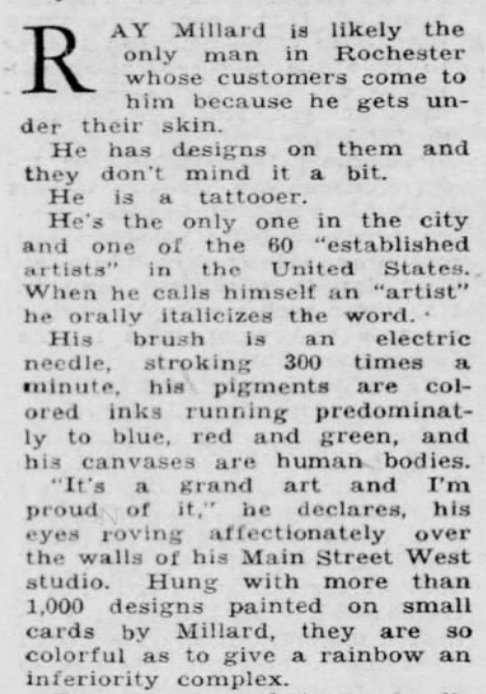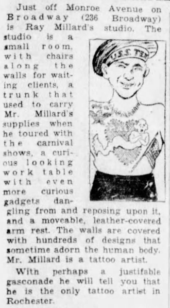 By the time Henry Clune wrote an article on him in 1935, Ray Millard was tattooing out of a studio at No. 236 Broadway, just around the corner from Monroe Avenue.
