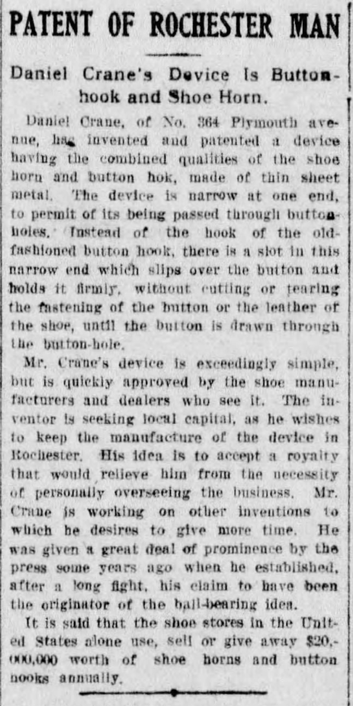 Crane fancied himself somewhat of an inventor; he wasn’t wholly incorrect in that self-assessment. He had a couple of successful patents under his belt, mostly related to his profession of shoe-making.