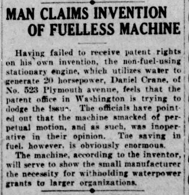 However, he seems to have lost the thread; by the time he was 76 in 1924 Crane was attempting to patent a “non-fuel-using” water engine. The patent office–probably rightly–determined that the engine amounted to a perpetual motion machine and denied the patent.