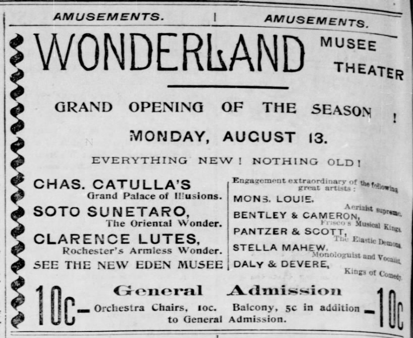 Clarence had moved on from the local theater to doing circuits nationally by 1894; however, he made return engagements in Rochester during the early 1900s. Though there’s no evidence of him doing such a thing, I wouldn’t be surprised if he drew attention to a show by signing cards for passers-by, possibly out of “The Hole in the Wall”. I can’t prove it, but I can’t disprove it.