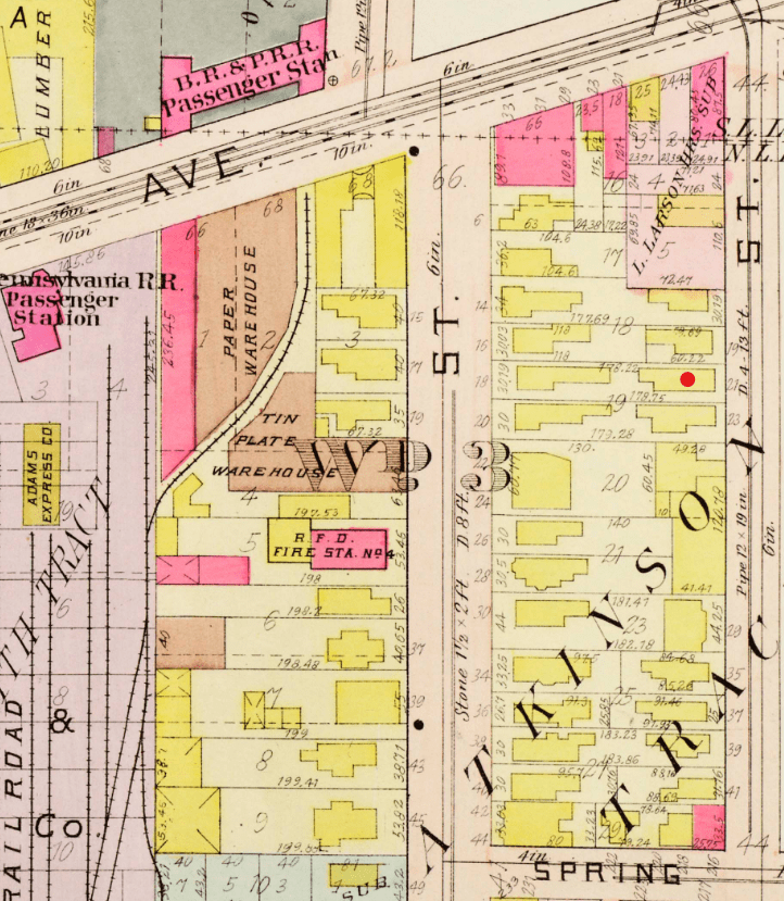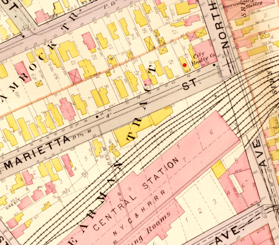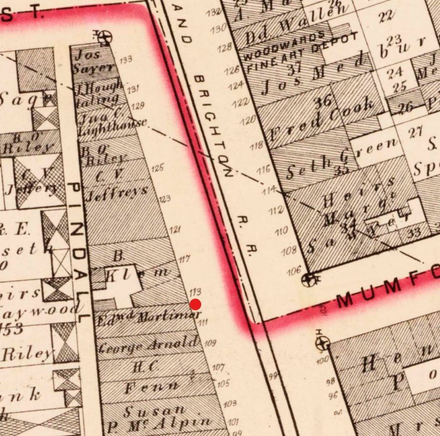 Red: Approximate site of No. 13/51 Greenleaf Street, former home of E. P. Rummel.