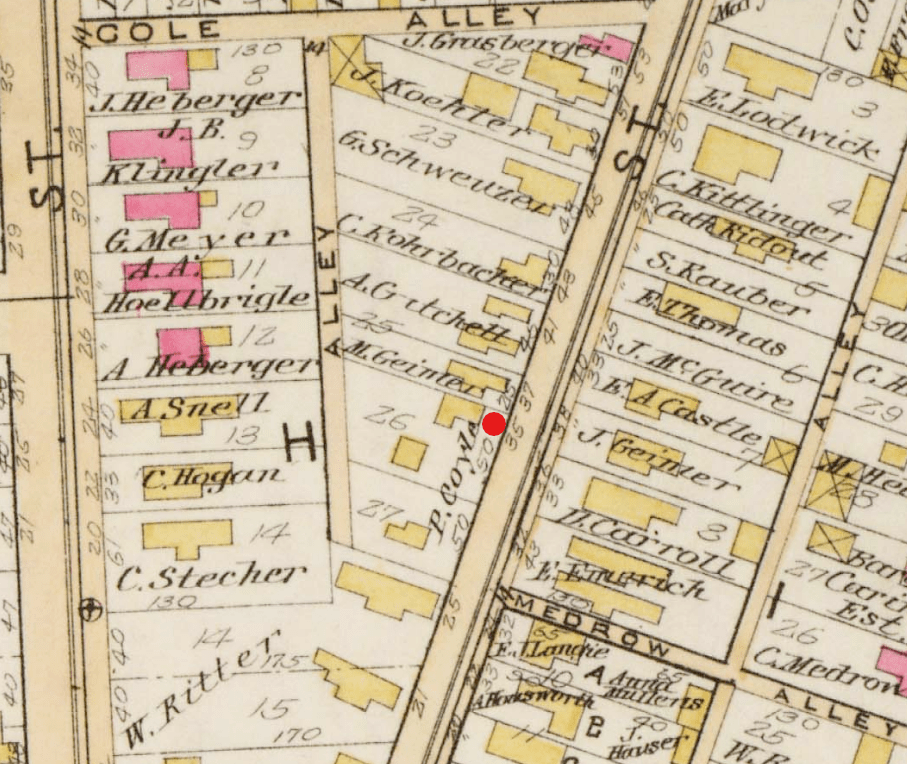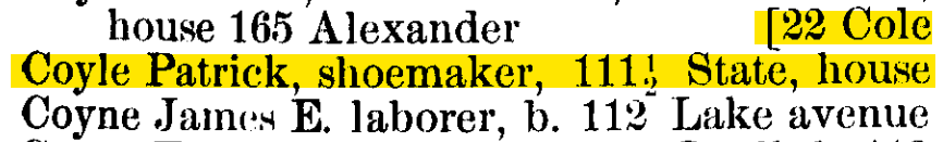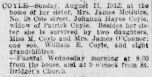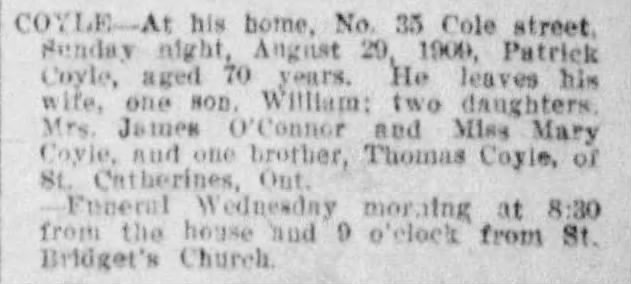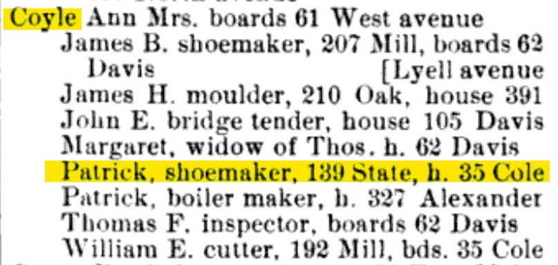 Patrick Coyle was married to Johana Hayes; his sister and brother-in-law, Bridget Hayes and James McGuire, respectively, lived across the street at No. 38 Cole Street. No. 38 Cole would remain in McGuire allied families until 1934 with the death of Mary McGuire Riley.