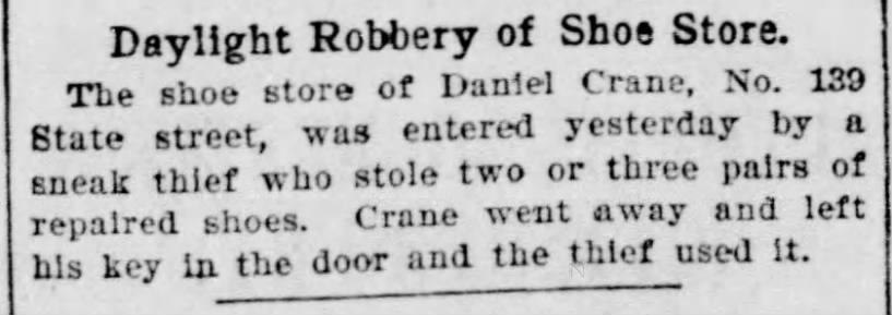 From Patrick Coyle, the tiny storefront seems to have passed directly to another shoemaker, Daniel Crane.