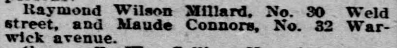Raymond William Millard married his wife, Maude Connors, in 1917. At the time, Millard lived at No. 30 Weld Street; Connors lived at No. 32 Warwick Avenue.