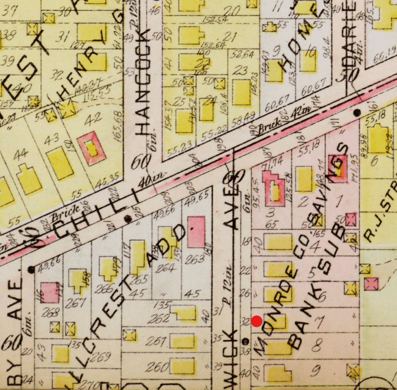 Red: No. 32 Warwick Avenue, home of Maude Connors at time of marriage.