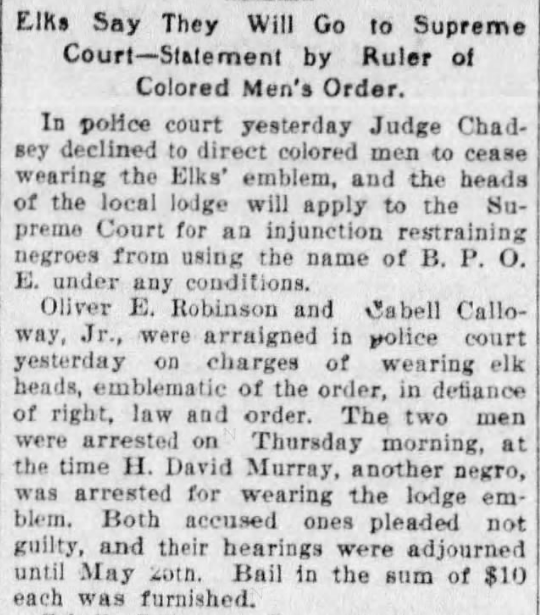 The following year, 1906, Robinson would have an indirect brush with fame when he was arrested alongside Cabell Calloway, Jr., father of famed “Minnie the Moocher” singer Cab Calloway. In 1906, Cabell Calloway, Jr. had started a new branch of the “Improved Benevolent and Protective Order of Elks of the World“, a fraternal organization he had been a member of while living in Baltimore. In May 1906, five members of the organization were arrested when a member of the white Elks, Dr. Richard Decker, complained that they were wearing badges bearing the elk head emblem of the organization.