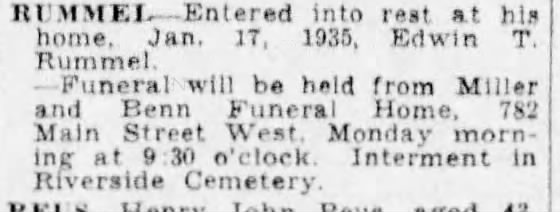 Edwin Rummel died January 17th, 1935, at the age of 60; as a final little insult, his middle initial is given as “T” instead of “P” in his obituary.