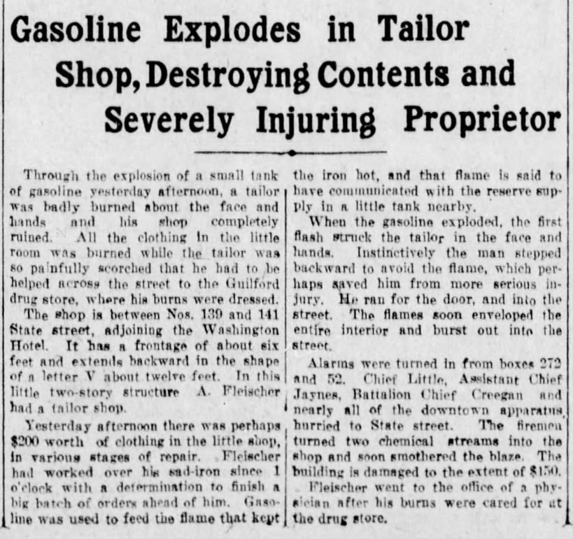 “The business place of Alexander Miller, a window washer, is only the width of the entry door and its sidelight. Its address is 139 1/2 State Street. The narrow structure is sandwiched between the Normandie Hotel, 137 State Street, and Thomas P. Madden’s saloon at 41 State Street.“