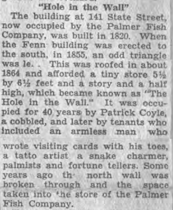 “Hole in the Wall” – The building at 141 State Street, now occupied by the Palmer Fish Company, was built in 1820. When the Fenn building was erected to the south, in 1855, an odd triangle was left. This was roofed in about 1864 and afforded a tiny store 5½ by 6½ feet and a story and a half high, which became known as “The Hole in the Wall.” It was occupied for 40 years by Patrick Coyle, a cobbled[sic], and later by tenants who included an armless man who wrote vising cards with his toes, a tatto[sic] artist a snake charmer, palmists and fortune tellers. Some years ago the north wall was broken through and the space taken into the store of the Palmer Fish Company.
