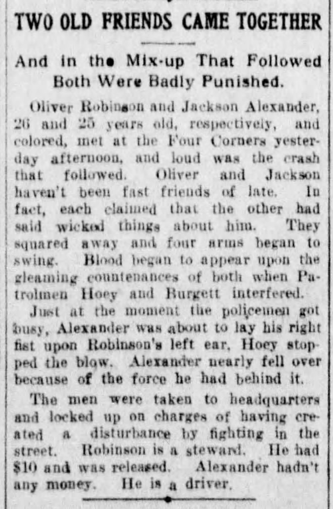 It seems like Jackson Alexander had some sort of problem with Robinson, to my eyes: Robinson worked at the Arcade as a steward at this time, where Alexander looks to have sought him out and attacked him. I don’t have all the facts, of course; just putting two and two together.