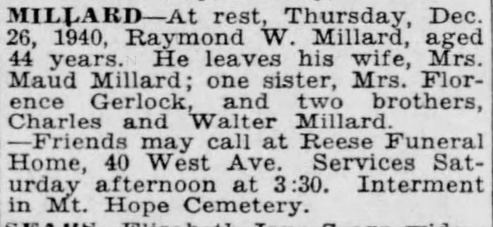 Sadly, Raymond W. Millard died at age 44 on December 26th, 1940. He had apparently spent several months of 1940 in the Iola Sanitarium, implying that he likely died from tuberculosis.